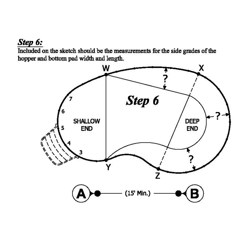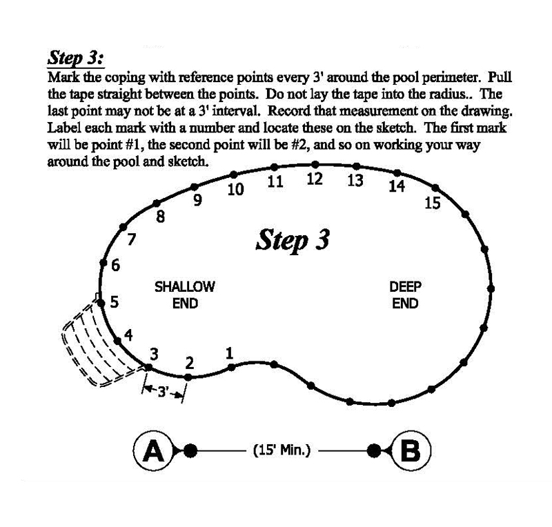 Never take any measurements or dimensions for granted. Considerable time and dollars are lost because a homeowner incorrectly identifies his pool or a contractor assumes that a nominal 16' x 32' pool is exactly 16'0" x 32'0". Dimensions vary among manufacturers and some installers make changes during the original installation of the pool. You should measure, record and order your liner on the basis of exact finished dimensions of the pool or the exact finished dimensions you are planning to use. From that point on leave the rest up to The Vinyl Works. They will tailor-make the liner for a proper fit. The proper procedure for measuring a typical pool for a liner is as follows: