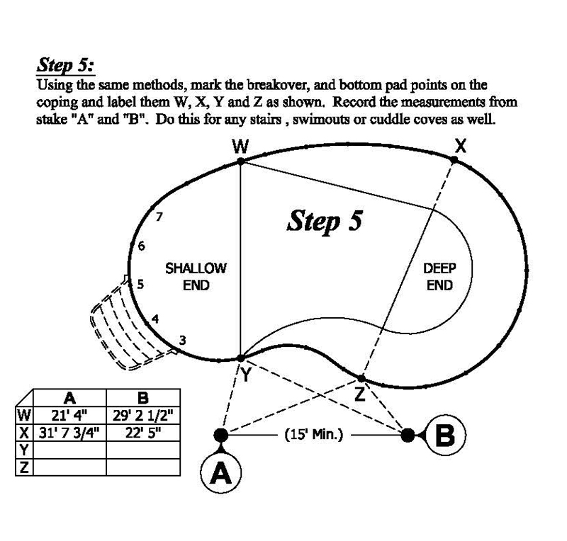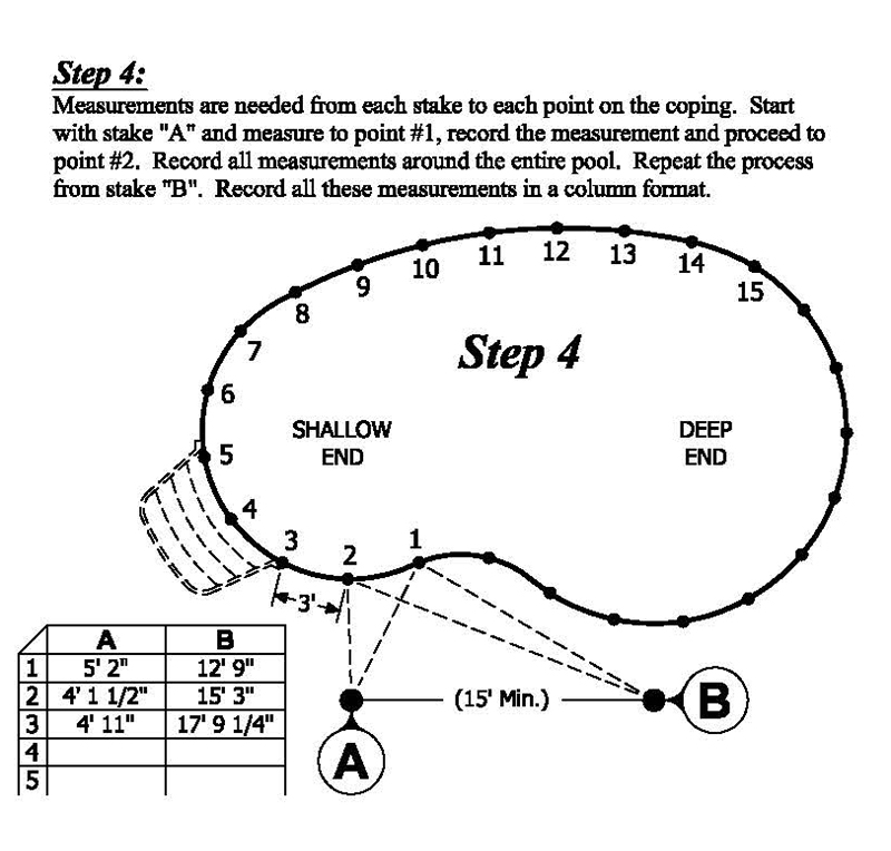 When measuring pool corners, measurements should be taken as indicated below. Also, see pool shapes. Use our Diagonal Conversion Chart For Grecian Pools,