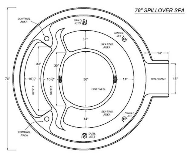 The Vinyl Works, Inc. will not warranty hot water spa liner applications. It is important that you relay this information to the dealer. All inground pool liner considerations still pertain to spill-over spas. (example: you will need to provide attachment method bead style or overlap, sidewall dimensions, tread and riser for any benches incorporated in spa, bottom configuration, depth, etc.) It is important that you provide detailed information about the liner attachment at the spill-over area. It may also be necessary to provide freeform type dimensions since most concrete and gunite installations are freestyle.